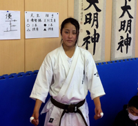私は、小学校二年生の時に、強くて優しい皆が憧れるヒーローのようになりたくて空手を始めました。私は、稽古をやっていくについて、空手が大好きになっていき、難しい型を覚えた時の達成感や、うれしさ、楽しさ、試合で負けた時の悔しさなどを知っていきました。もちろん辛い時もあったけれど、それを乗り越える力を身につけられたと思います。そして、段々と級を上げていよいよ昇段審査を受けることにしました。私は毎日、型を中心とした稽古をしていたので、昇段審査で十人組手をやることがとても不安でした。審査のために、久しぶりにスパーリングをやると、ますます私にできるか不安な気持ちが増してきてしまいました。でも諦めないで練習をたくさんして、合格できるよう頑張りました。審査当日、とても緊張したけれど、落ち着いてやることができました。十人組手では、握り棒を数回落としてしまったけれど、素早く動くことができました。最後は疲れて動きが遅くなってしまったけれど、自分の中ではうまくいったと思います。審査が終わった後は、一気に緊張がほぐれ、「ついにやったぞ」という達成感で胸が一杯になりました。ここまで来られたのも、家族の支えや、先生方の指導、自分自身の諦めない力があったからだと思います。今回とることのできた黒帯は、たくさんの人の支えから得ることができたものです。だから、いつも周りで応援してくれている人に、感謝の気持ちを忘れないようにしたいです。この経験で、私の心は大きく成長したと思います。辛くても耐える力、継続する力などを付けることができ、空手をやったことで自分が強く変われたと思います。空手から私はたくさんのことを学びました。しかし、黒帯をとったから終わりではなく、型で世界一になる目標や、人としてもっと成長していくために私は努力を続け、挑戦を続けていきたいです。