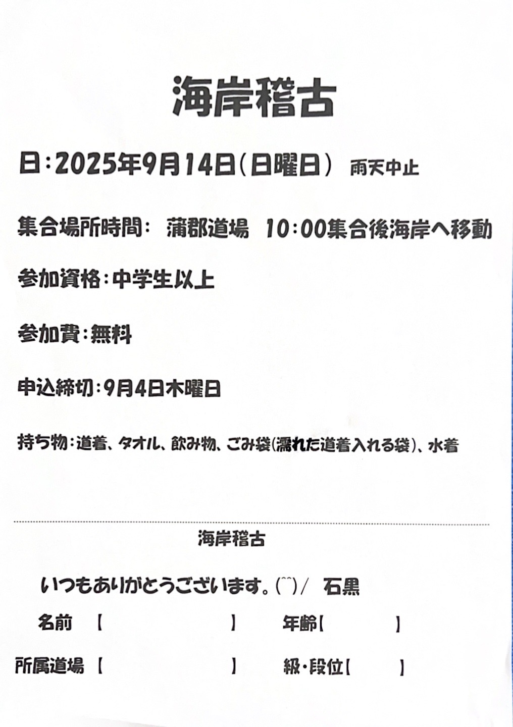 「海岸稽古 9/14(日) 中学生以上」のご案内となります。