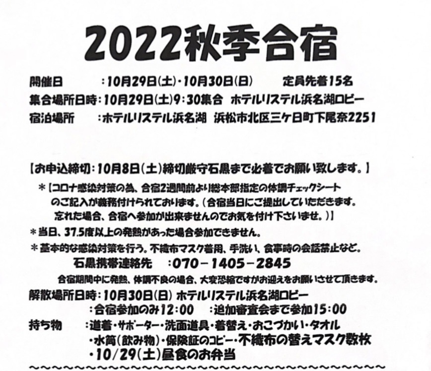 いつもお世話になり、誠にありがとうございます。^ ^2022秋季合宿のお知らせとなります。
