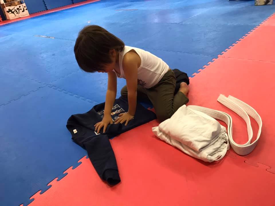 当道場では、自宅から道着を着てくる事を推奨しておりません。普段の格好で通ってもらい、道着は持参してもらっています。どんなに小さなお子様でも自分で道着に着替え、帯を結び、帰りは自分で道着をたたんで帰ります。初めは道着をたたんでもグチャグチャです。ですが、しばらくすると必ず綺麗にたたんで帰るようになります。
