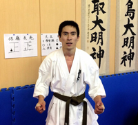 僕が空手を始めたのは4才のときです。その頃は、まだ弱くてすぐに泣いたり怒られたりしました。でも、空手を嫌いにはなりませんでした。なぜなら、父は愛情を持って叱ってくれたからです。いつも先輩にボコボコにされて辛かったけど、だんだんと強くなってきているのを感じました。そして、小学3年生のときに初めて県大会で優勝しました。この優勝で僕は自信がつきました。もし負けてしまってもダメだったところをビデオで見てそのだめだったところを一生懸命練習しました。そしてついに、国際大会で優勝することができました。優勝したときは、今までに感じたことがないほどうれしかったです。その後の、全日本大会でも優勝することができました。しかし、6年生の冬腰椎分離症になってしまいました。その原因は、激しく運動をしていたからです。腰椎分離症が完治するまでに約6ヶ月かかりました。その間は空手ができなかったけど、できる範囲のトレーニングをしました。腰椎分離症が治ったら次の試合に向けて頑張って練習しました。中学1年生のときにスタミナを付けようと思って走ることにしました。最初は足が筋肉痛になったりすぐに疲れていました。スタミナと、体力がかなりついたと思います。そして中学2年生の秋、昇段審査を受けるときが来ました。10人組手はとても辛かったけど、いい経験になりました。