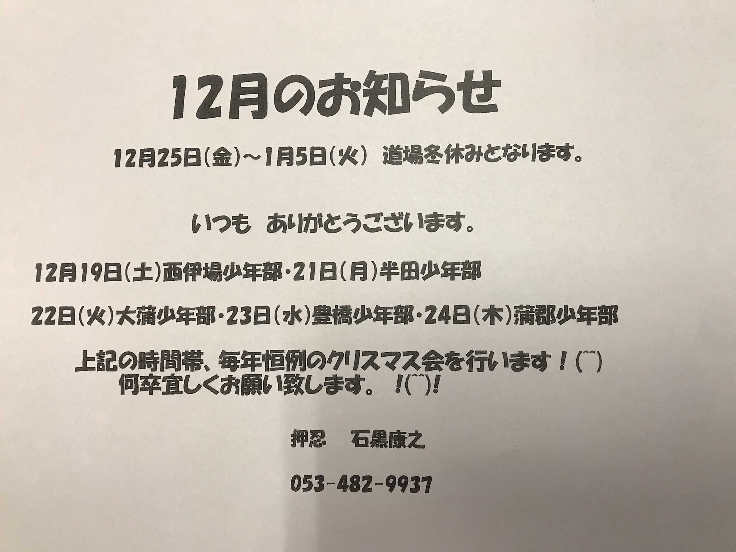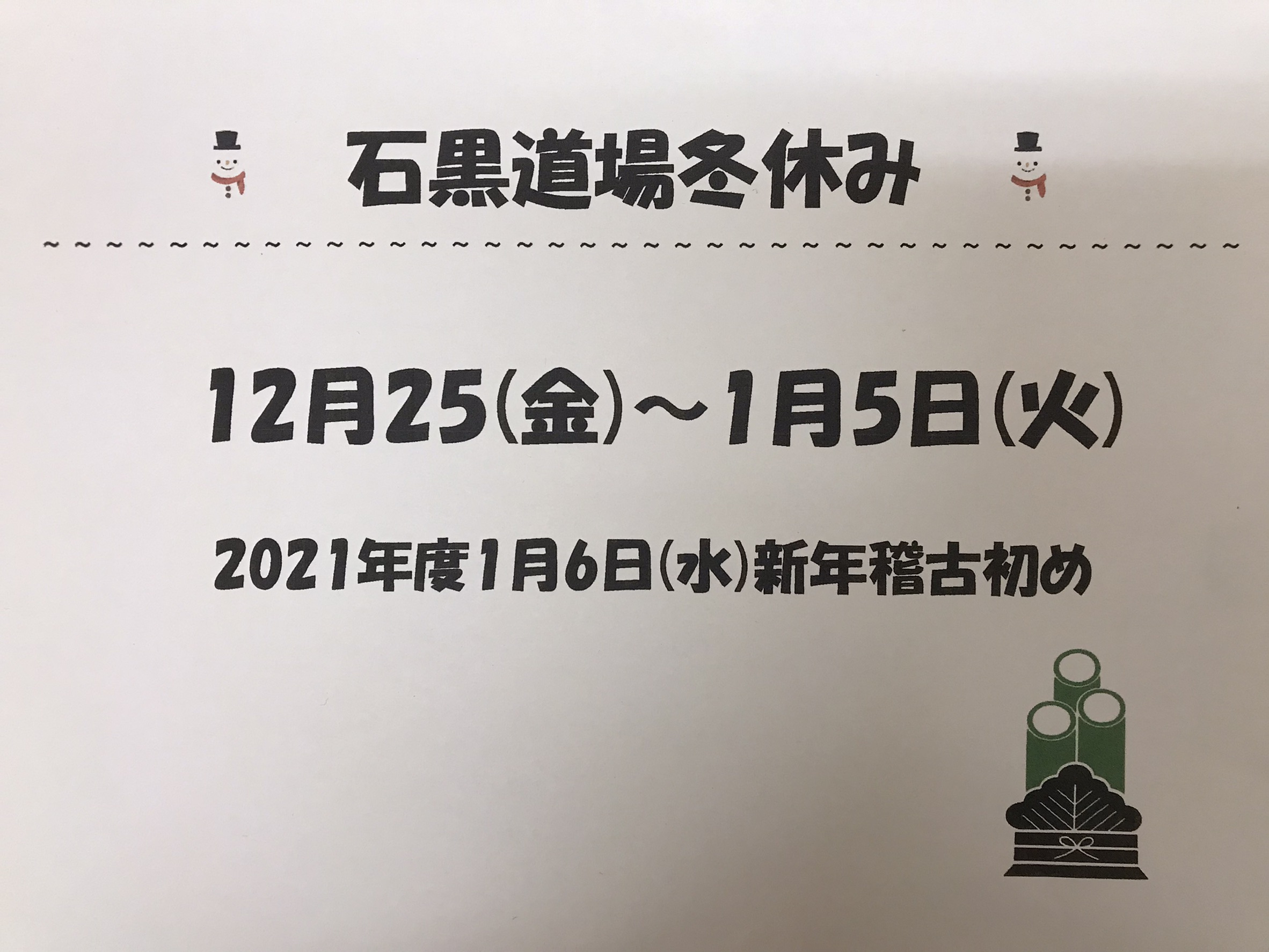 道場冬休みのお知らせ