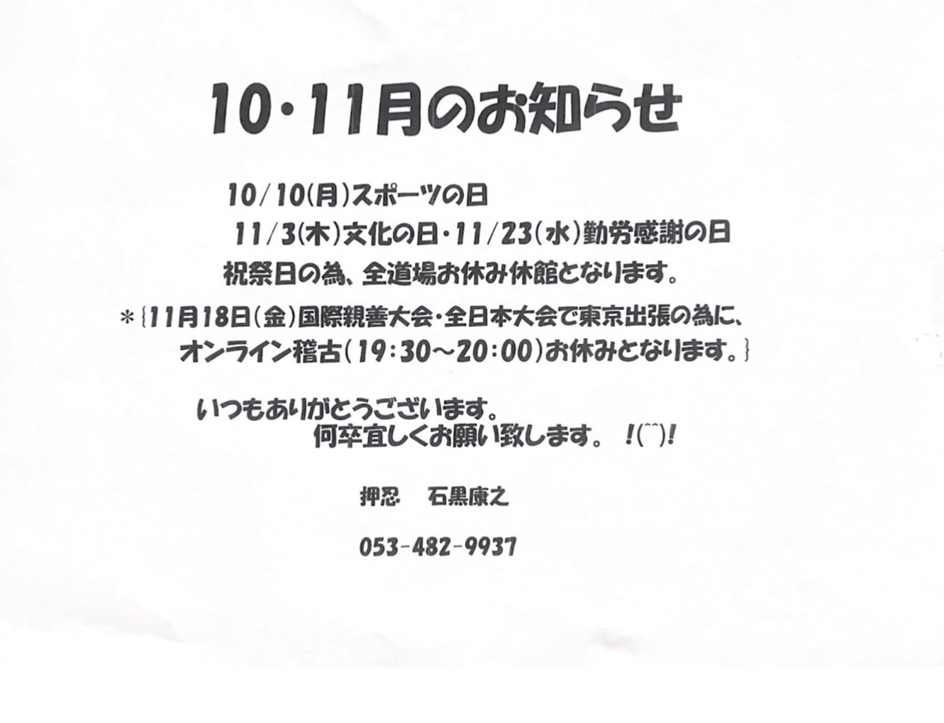 「秋季審査補習稽古・追加昇級審査会・昇段審査会のお知らせ」いつもお世話になり、誠にありがとうございます。