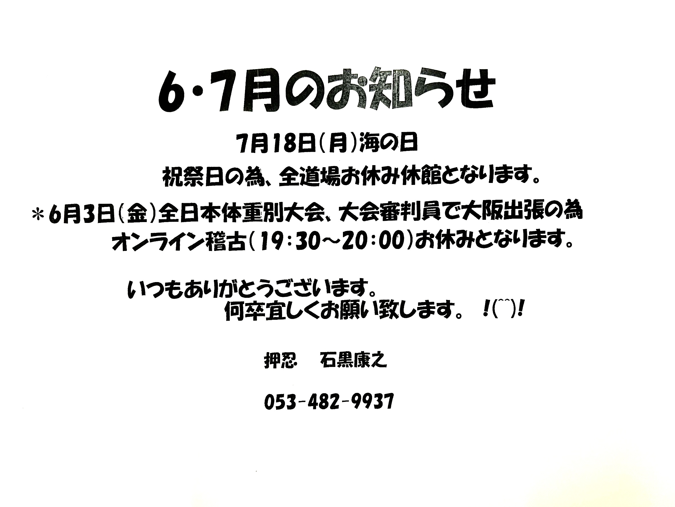気賀道場指導員の体調不良により、誠に申し訳なく心苦しいのですが、