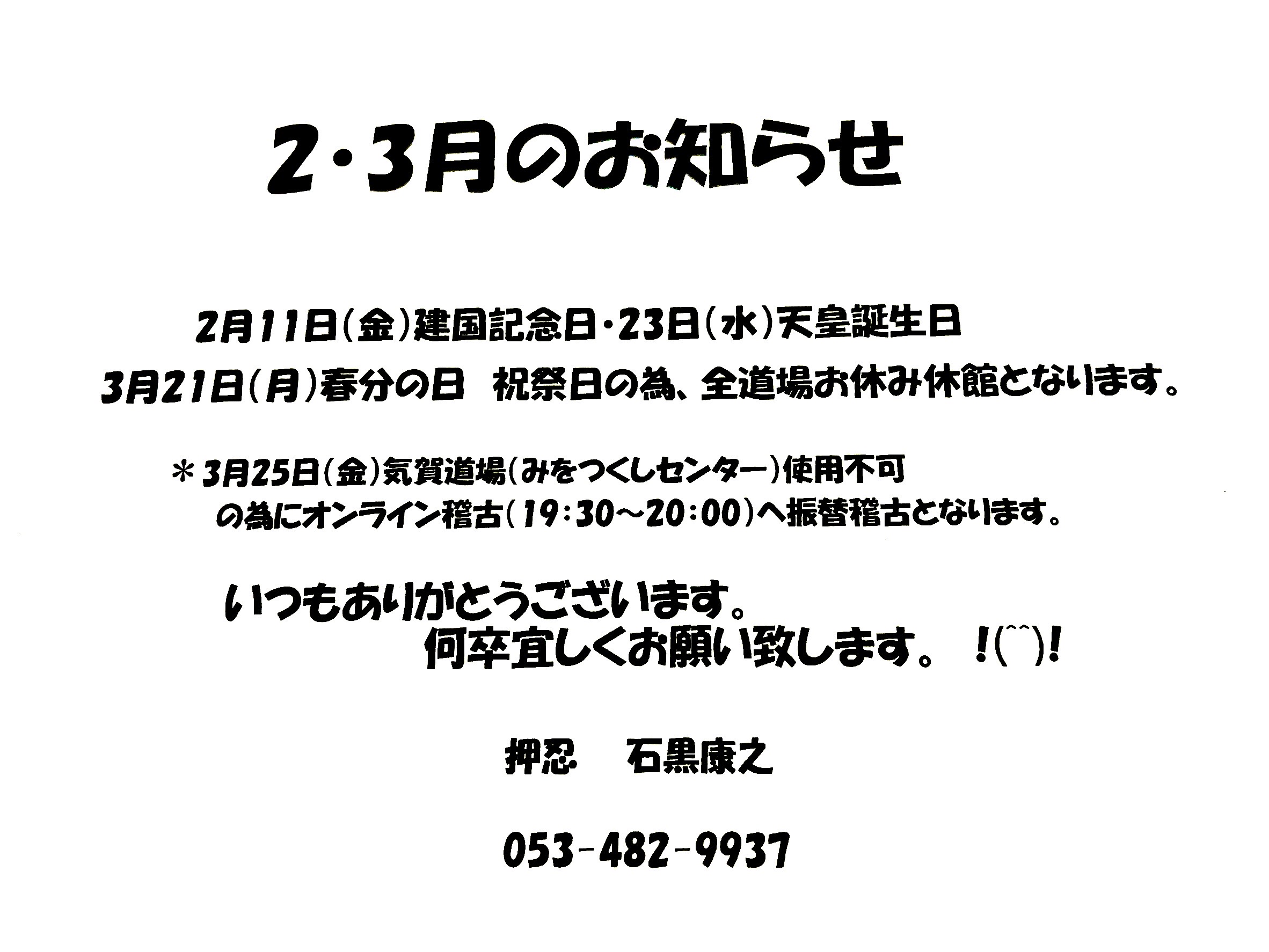 *なお、2月25日金曜日・3月4日金曜日のオンライン稽古のみ、私(石黒)が自宅療養中につき大変恐縮ではありますがお休みとさせて頂きます、申し訳御座いません。」